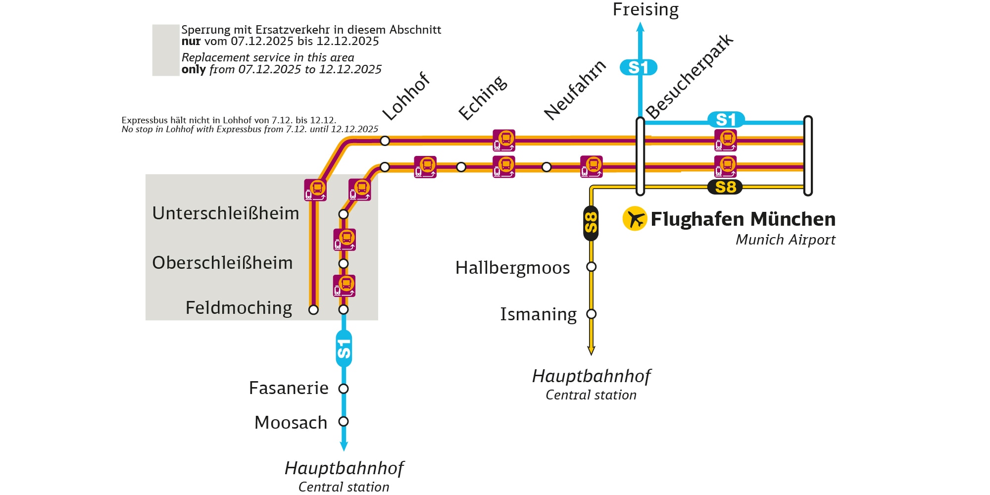 - Streckensperrung mit Ersatzverkehr zwischen Lohhof und Flughafen mit allen Unterwegshalten.