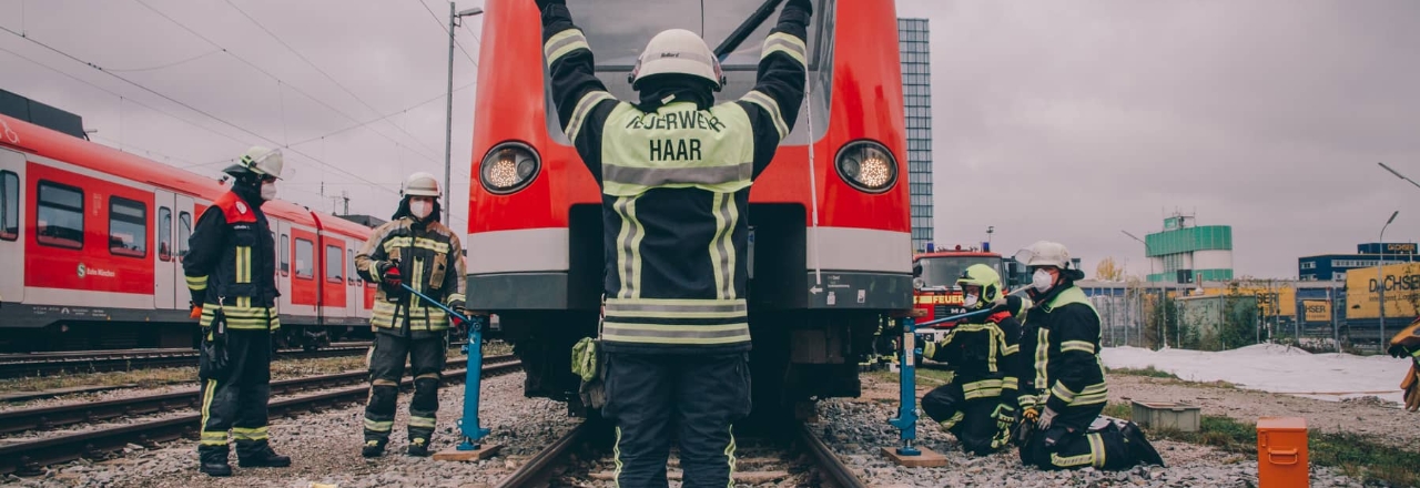 Am Rande der Abstellgleisanlage im Werk Steinhausen stehen sie aufgereiht: Je ein bis zwei Mitglieder der Freiwilligen Feuerwehr aus Neubiberg, Ottobrunn, Pullach, Haar, Taufkirchen, Grünwald und Unterhaching. Daneben unser S-Bahn Notfallmanager Werner, der die Schnittstelle zwischen der S-Bahn und den Feuerwehren ist und unser (ehemaliger) Kollege Stephan, der die Schulung organisiert hat. Normalerweise findet die jährliche Schulung im Mai und mit mehr Mitgliedern statt, wegen der Corona-Auflagen seinerzeit musste die Anzahl jedoch reduziert werden. Auch für die Praxis gilt: Safety first. Bevor es mit den praktischen Übungen losgeht, gibt Kreisbrandinspektor Erwin die wichtigsten S-Bahn Fakten durch, denn bei Bahneinsätzen ist viel zusätzliches Know-how nötig: Ein Zugteil wiegt rund 105 Tonnen, vollbesetzt, beispielsweise zu Wiesn-Zeiten, noch einiges mehr. Dieses Wissen ist wichtig, wenn es um das Anheben eines Zuges geht. Bis zu 500 Personen könnten in einer S-Bahn Platz finden, was wichtig zu wissen ist, sollte eine Evakuierung notwendig sein. Besondere Gefahr geht von der Oberleitung aus, denn durch die jagen 15.000 Volt: Abstandhalten ist also oberstes Gebot. Und hättet ihr gewusst, dass eine S-Bahn bei voller Fahrt und trockenen Schienen mit ihren 120 bis 140 km/h einen Bremsweg von 700 bis 800 Metern hat?