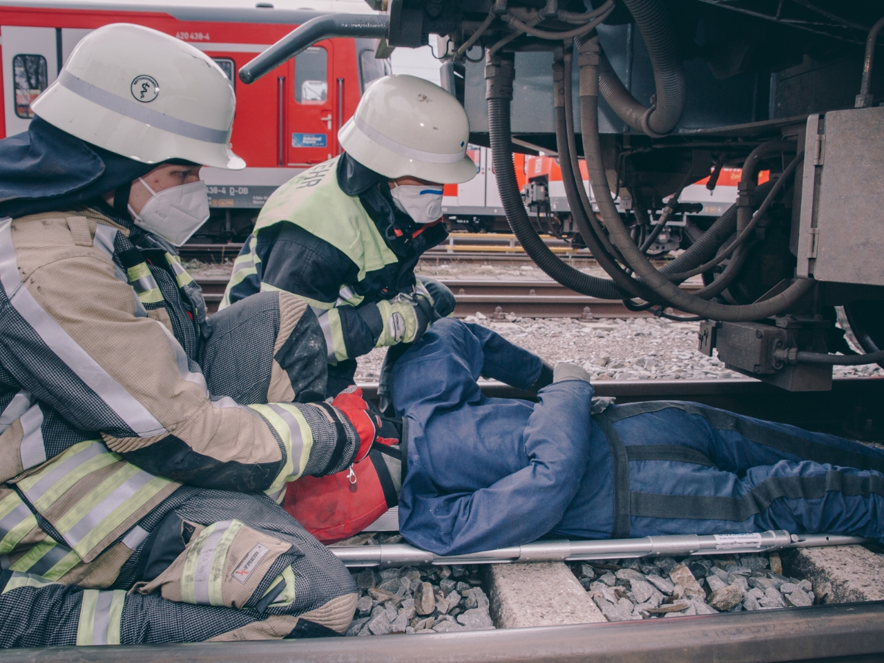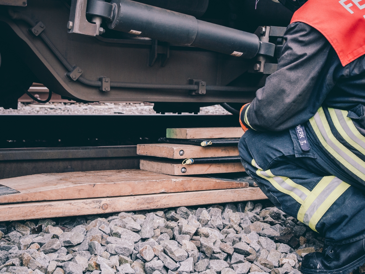 Wir wünschen es uns nie, aber es kann passieren, dass Gegenstände oder Personen unter die S-Bahn gelangen. In diesen absoluten Notfallsituationen ist schnelles und organisiertes Handeln gefragt. Für diese Übung hat Ausbildungsleiter Erwin eine 50 kg schwere Übungspuppe unter der S-Bahn platziert. Nun sind die Feuerwehrleute gefragt: Wie können sie so sicher und schnell wie möglich die Puppe retten? Die erste Gruppe spielt das Szenario an der Spitze der S-Bahn durch, Gruppe zwei muss von der Seite anrücken. Sicherheit geht vor, deshalb werden erst einmal große Holzkeile an den Rädern der S-Bahn platziert, sodass diese gegen unbeabsichtigtes Wegrollen gesichert ist. Dann kommen die blauen hydraulischen Hebewerkzeuge, die sogenannten Büffelheber, zum Einsatz. Damit Gruppe eins die S-Bahn von vorne anheben kann, müssen beide Heber parallel betätigt werden. Um sicherzustellen, dass dies auch gleichmäßig geschieht, behält Feuerwehrfrau Doris alles im Blick und gibt Kommandos. Langsam hebt sich die S-Bahn um einige, wichtige Zentimeter.